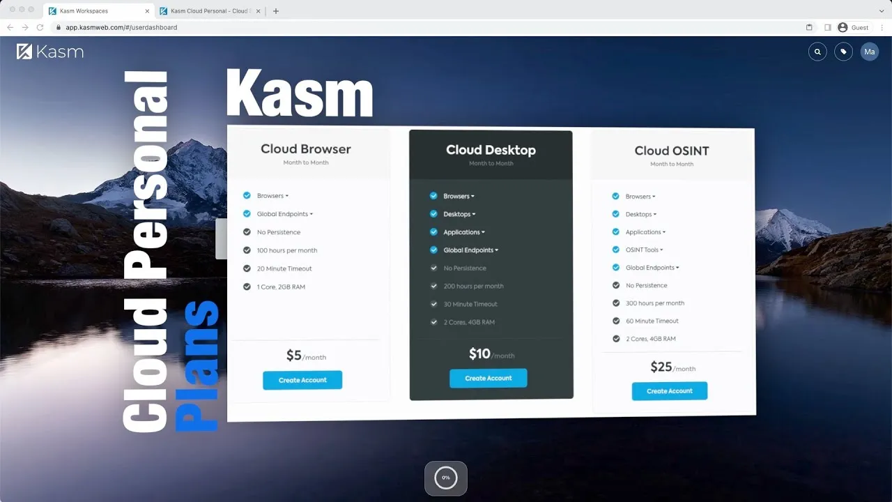 Kasm Cloud Personal provides individual on-demand Workspaces. Workspaces are deleted after each use and do not allow software installs or data persistence. For customized workspaces with data persistence, please visit our homepage