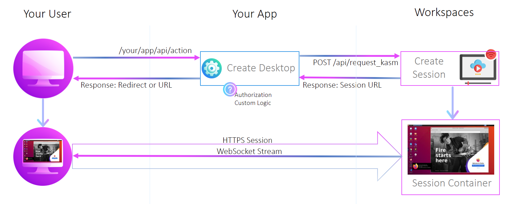 The Kasm Workspaces Developer API can be leveraged to extend the systems functionality and/or integrate with an exiting platform. Integrators interface with the API to create and manage sessions, users and groups.