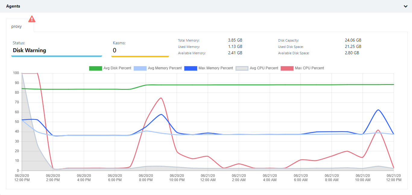 Historical CPU, Memory, and disk utilization can be tracked for an Agent by viewing the Dashboard in the Kasm UI.