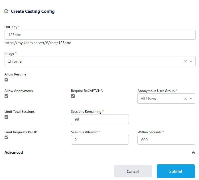 Session Casting allows administrators to expose external facing URLs that will automatically launch a Kasm session. These Casting URLs can optionally be unauthenticated and protected by ReCAPTCHA, Referrer, and IP rate limits.