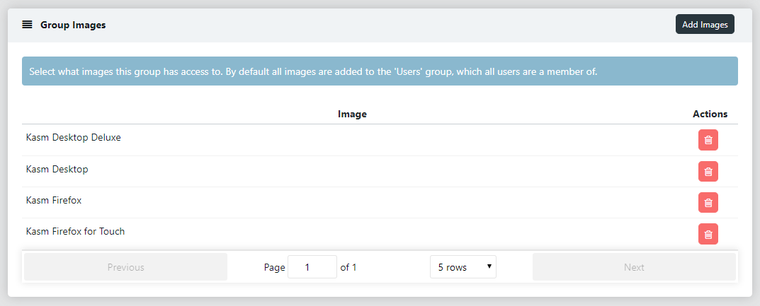 Administrators can define which Images are available to each group. By default newly created images are automatically assigned to the All Users group. This behavior can be changed by modifying the Add Images To Default Group global Settings.