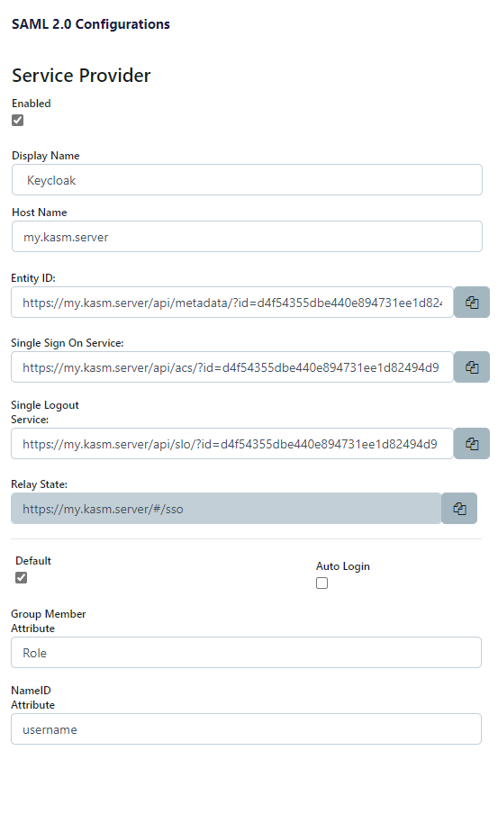 The SAML 2.0 Configuration page will auto-generate the Entity ID, Single Sign On Service, Single Logout Server, and Relay State values.
