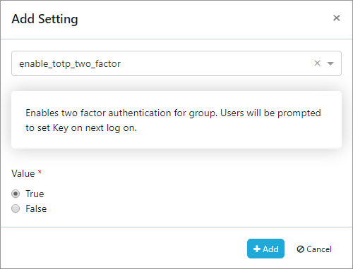 Select the “enable_totp_two_factor” setting and select True to add to all of the users in the group