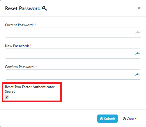 Check the “Reset Two Factor Authenticator” checkbox and then click Submit