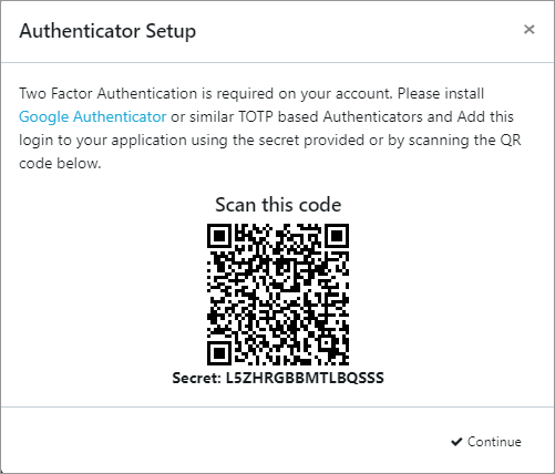 Two factor authentication can be enabled by the administrator through group settings. Each user will be required to setup their own secret and authentication application during their next login.