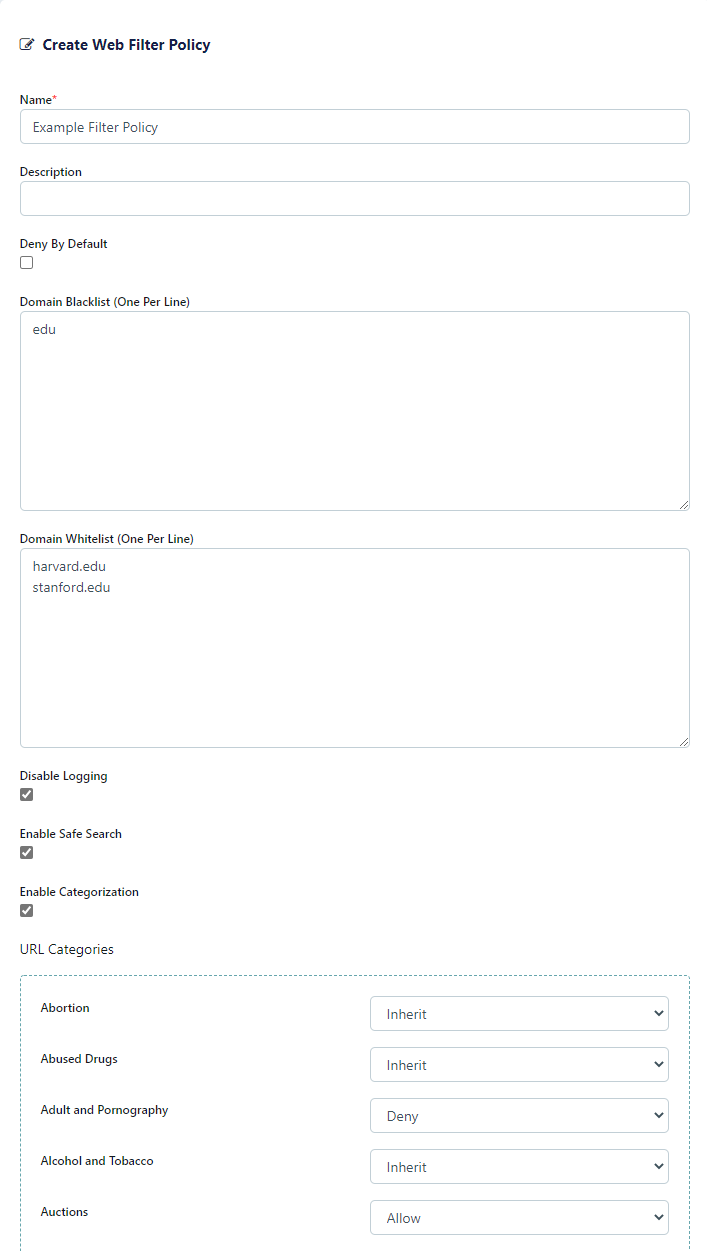 If checked, all requests will be denied unless the domain is added to the Domain Whitelist, or the category of the domain is set to allow. If unchecked, all requests will be allowed unless the domain is added to the Domain Blacklist, or the category of the domain is set to deny. |