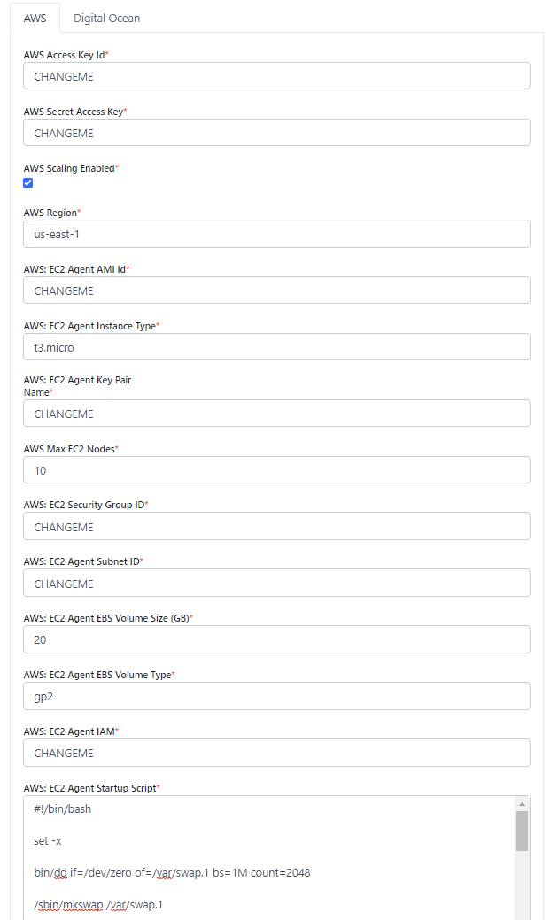 When an Agent is created, the compute resource (e.g AWS EC2 / Digital Ocean Droplet) will have a set amount of CPU and Ram as defined by the cloud provider’s instance type. This setting should typically be set to match the instance type but can be set to a preferred value. The system uses this value to calculate how many slots a new Agent will provide. |