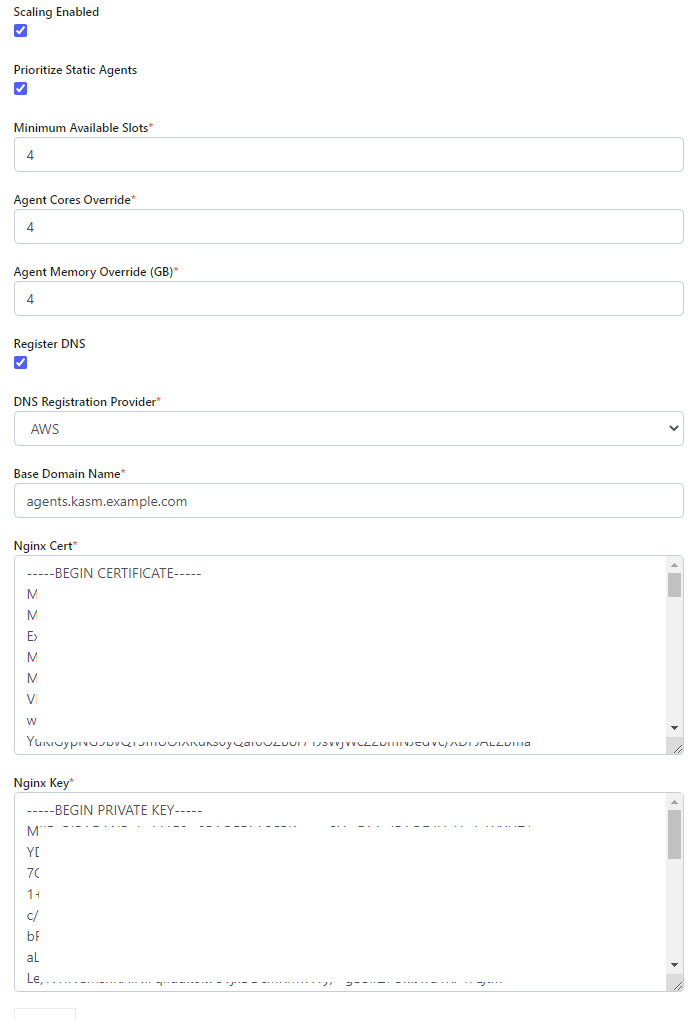Define a base name for the automatic DNS registration for the Agent. The system will create a full name using <ID>.<Base Domain Name>. If the Base Domain Name is “agents.kasm.example.com”, the full DNS name generated will be <ID>.agents.kasm.example.com (e.g 123abcd.agents.kasm.example.com). This Base Domain Name, must already be a registered DNS zone within the cloud provider’s DNS system. |