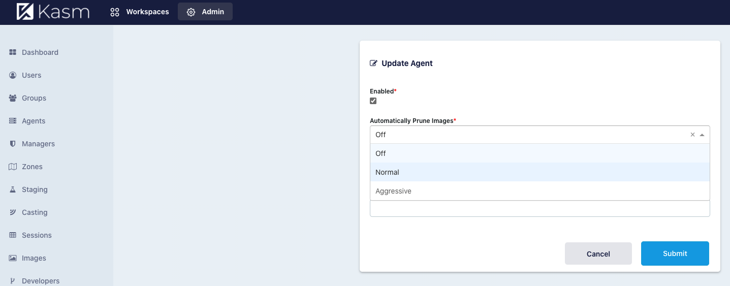 Before building the image, you must disable automatic image pruning. Navigate to the Admin pane in Workspaces and click Agents. Click the three dot icon and select edit on the agent. Change the automatic prune setting from the default of Normal to Off and click Submit.
