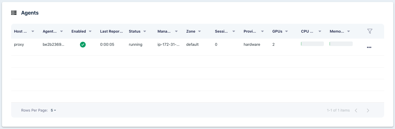 After installing Workspaces and logging in as an administrator, navigate to the Agents view under the Admin section. Here you will see a list of agents in the cluster, since this is a single server installation, there will only be one agent listed. Confirm that the agent shows 1 or more GPUs. If the agent lists 0 GPUs, see the troubleshooting section.