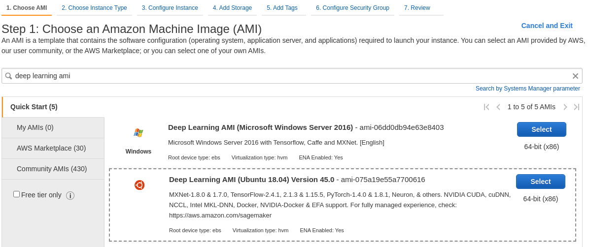 In the AWS Console, EC2 Dashboard, Click the Launch Instance button. In the first step, search for ‘Deep learning’ and select the Ubuntu 18.04LTS version of the Deep Learning AMI.