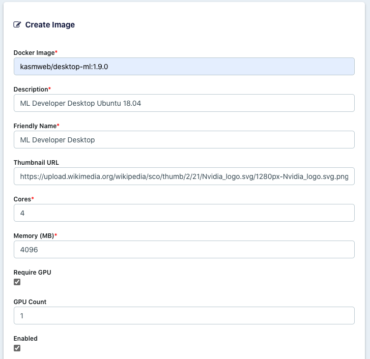 The final step is to define a Workspaces Image that utilizes this new Docker image. Log into Kasm Workspaces as an administrator and navigate to Images in the Admin panel. Click the create button. Fill out the information as shown in the following screenshot. Adjust the cores, memory, and GPU settings as desired. Scroll down and enter the categories Development and Desktop in the Categories field, this ensures the image shows up in those categories on the Workspaces home page.