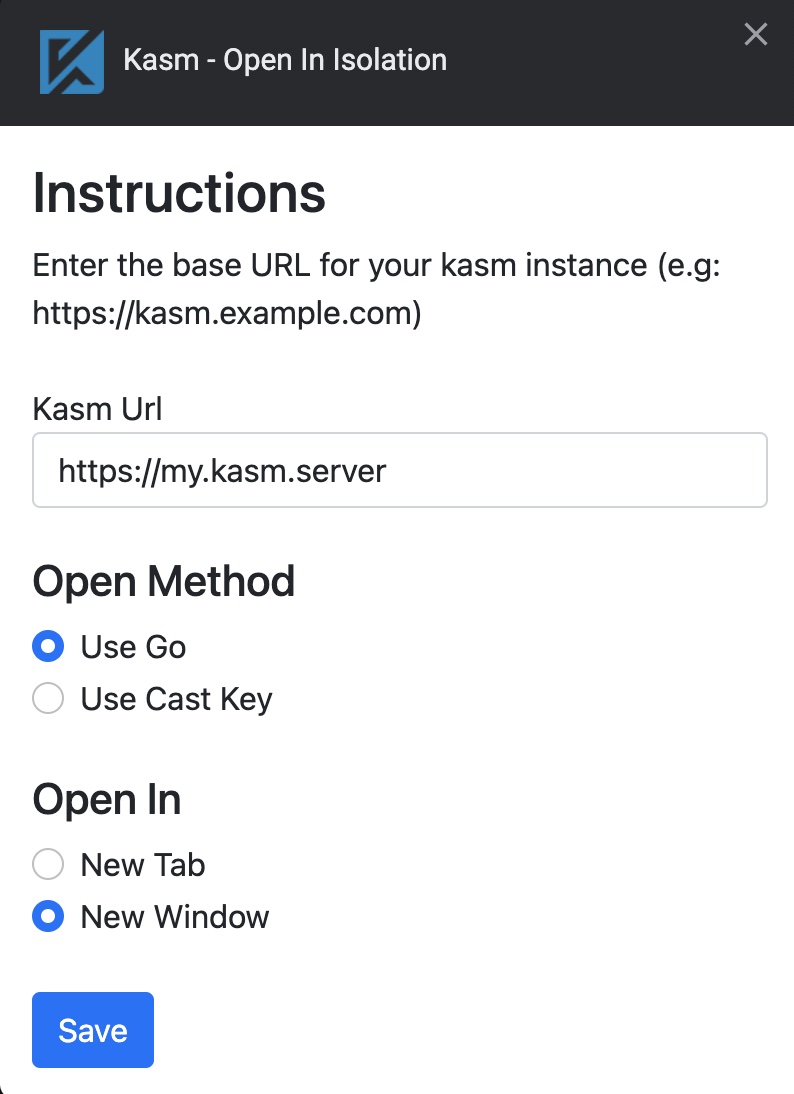 The Open-In Kasm Browser Extension provides a browser context-menu option for opening a link in an isolated Kasm Session. Allowing a user that is navigating the web to easily open untrusted links with the malware protection and anonymization that Kasm Isolation provides.