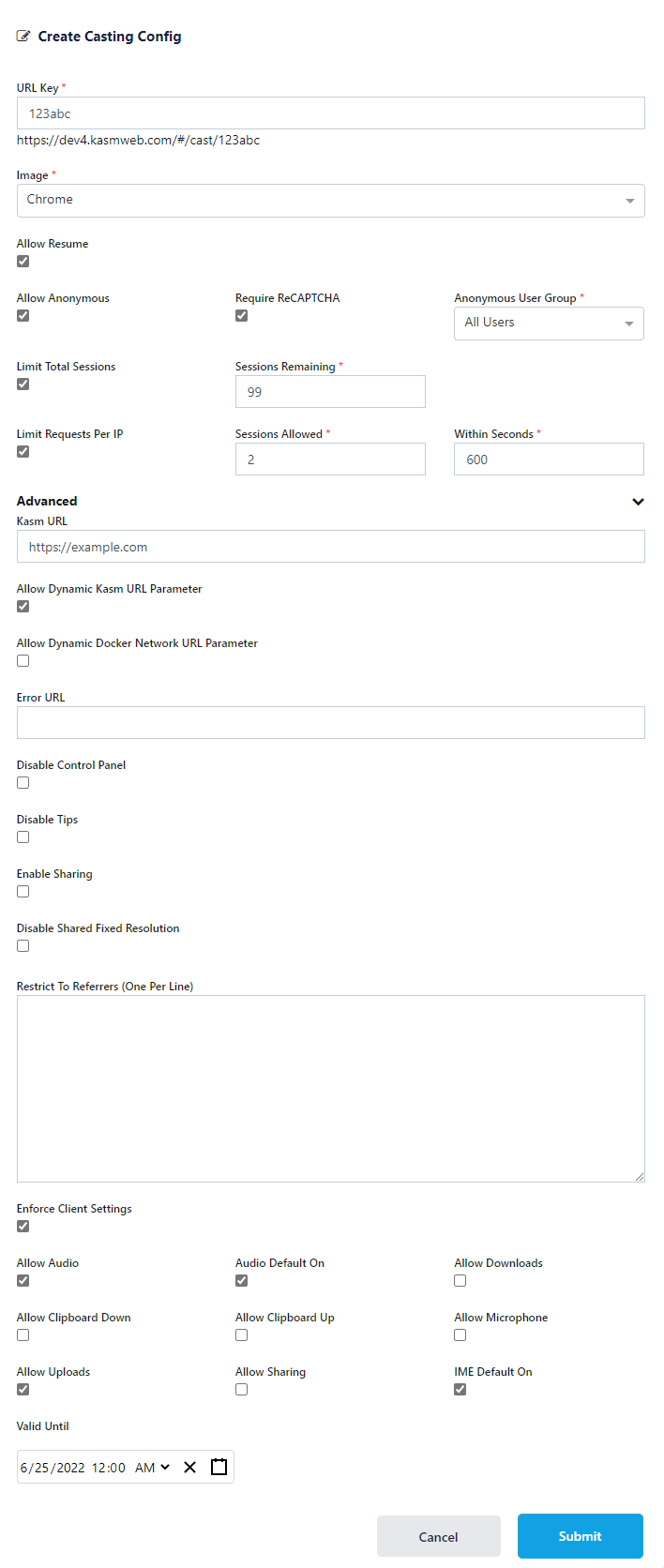 Session Casting allows administrators to expose external facing URLs that will automatically launch a Kasm session. These Casting URLs can optionally be unauthenticated and protected by ReCAPTCHA, Referrer, and IP rate limits.
