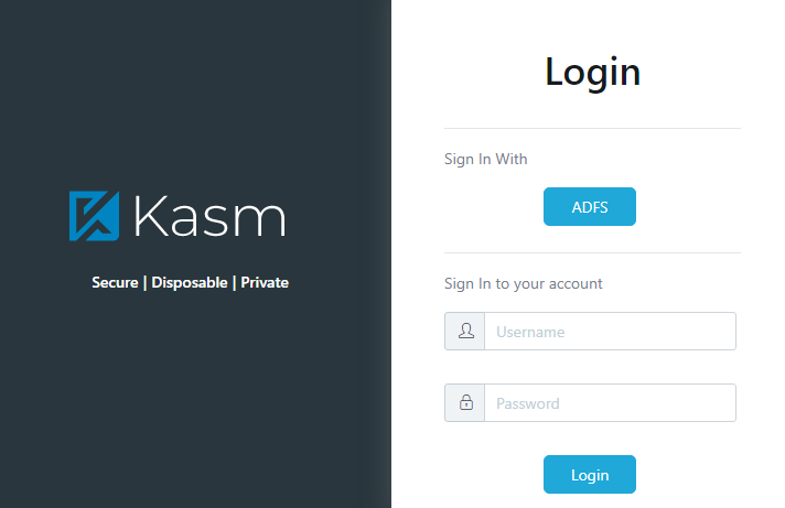 Navigate to the Kasm UI Login screen. An “ADFS” button is visible representing the SAML config.