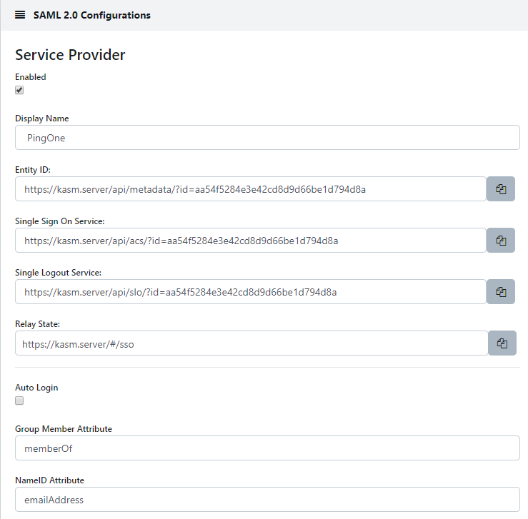 The SAML 2.0 Configuration page will auto-generate the Entity ID, Single Sign On Service, Single Logout Server, and Relay State values.