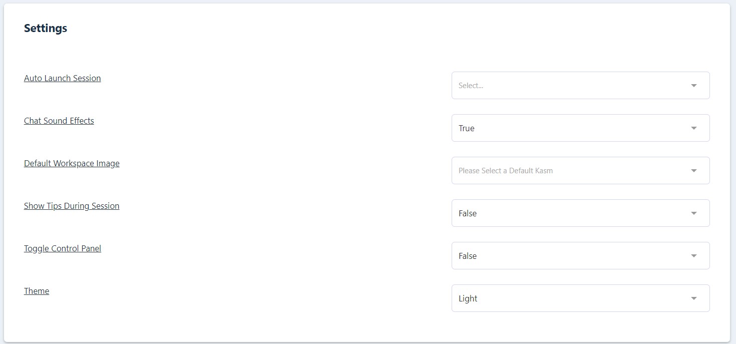 The Default Kasm Image to use. This is the Image that is used for the /go URL, clicking the Launch Now menu item, and for Auto Launch Session. This item overrides the corresponding group setting if defined.