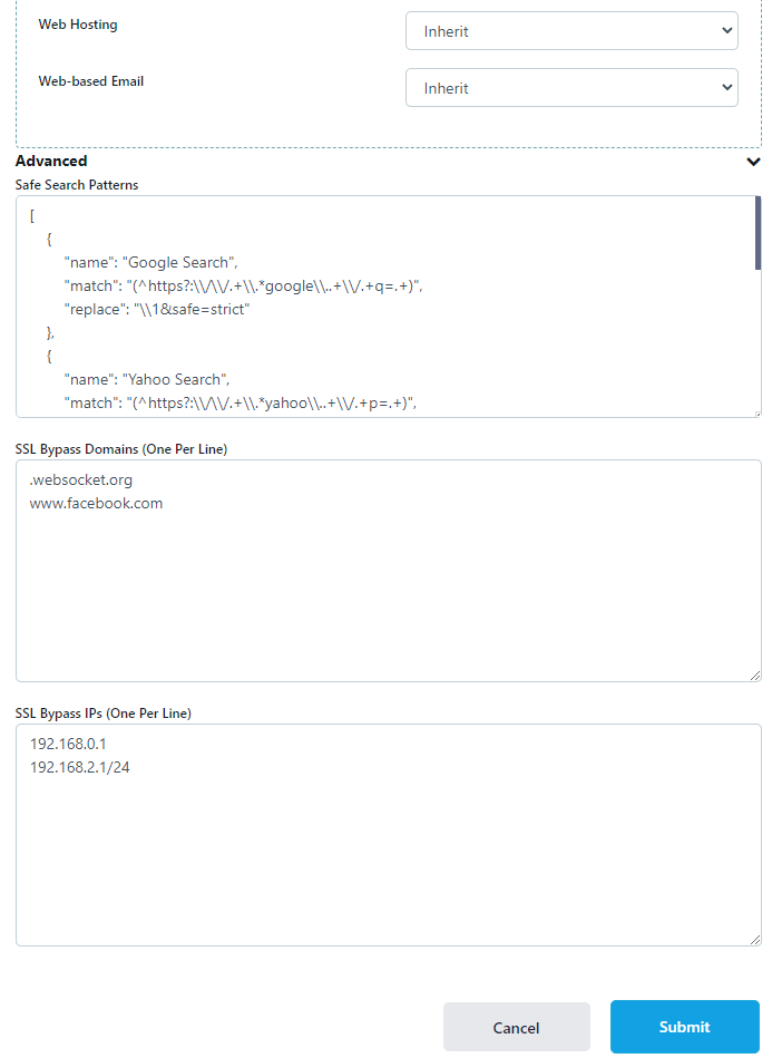 Web Filtering uses SSL inspection technology to enforce policy. In some cases, this technology will not be compatible with a website. Administrators can enter a list of IPs that will bypass this inspection to restore functionality. Enter an IP or CIDR notation one per line. |