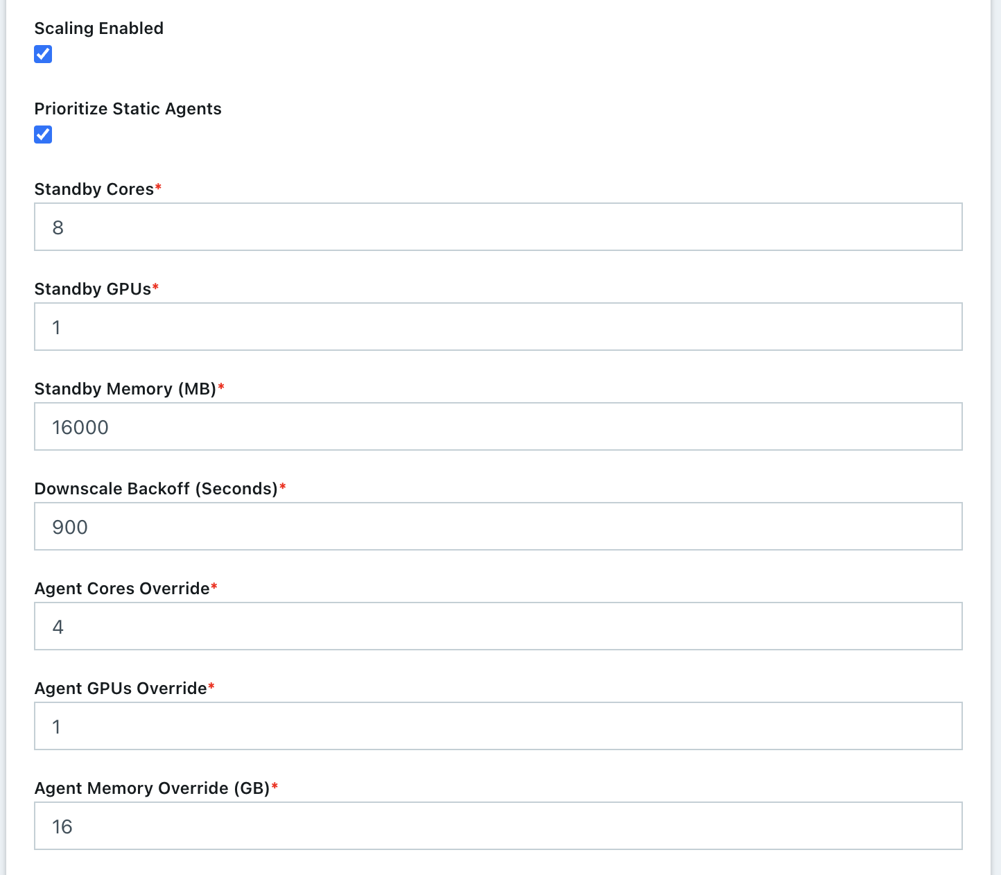 The number of standby cores that the system should try to keep “always available” at any given time in addition to any that is needed to satisfy the Staging Config requirements. If the number of available cores falls below this number, more Agents are created. If the number of available cores rises above this number, Agents are deleted as long as it wont result in the number of available cores falling below this number. A value of 0 indicates no additional standby compute is created. The AutoScaler will only provision enough compute according to the Staging Config requirements. |