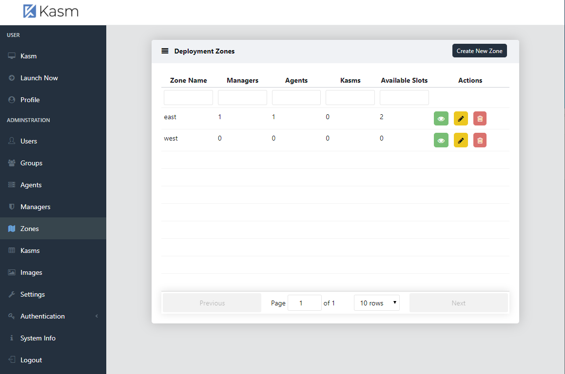 Once defined, the Kasm services need to be configured to be members of the given Zone. The Deployment Zone setting for API Servers (kasm_api, kasm_manager) is set their configuration file. The default zone is default