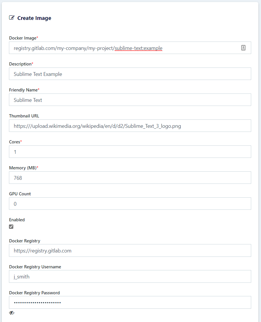 Register the image via the Kasm UI. Enter the full image name and tag as well as the docker registry. Enter the gitlab username in the Docker Registry Username field and the Gitlab password or access token under the Docker Registry Password field
