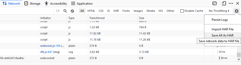 The following steps can be used to gather the Console logs and HAR networking data. The example is for Firefox, but is similarly applicable for Chrome/Chromium-based browsers.