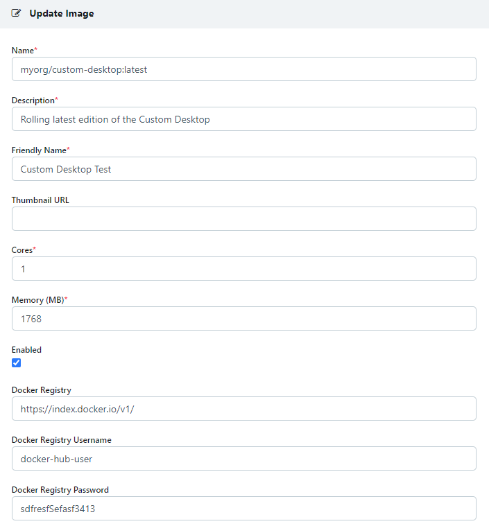 When defining the Image inside the Kasm UI, utilize the custom docker image name, registry , and if needed a username and password/access token needed to authenticate to the private registry.