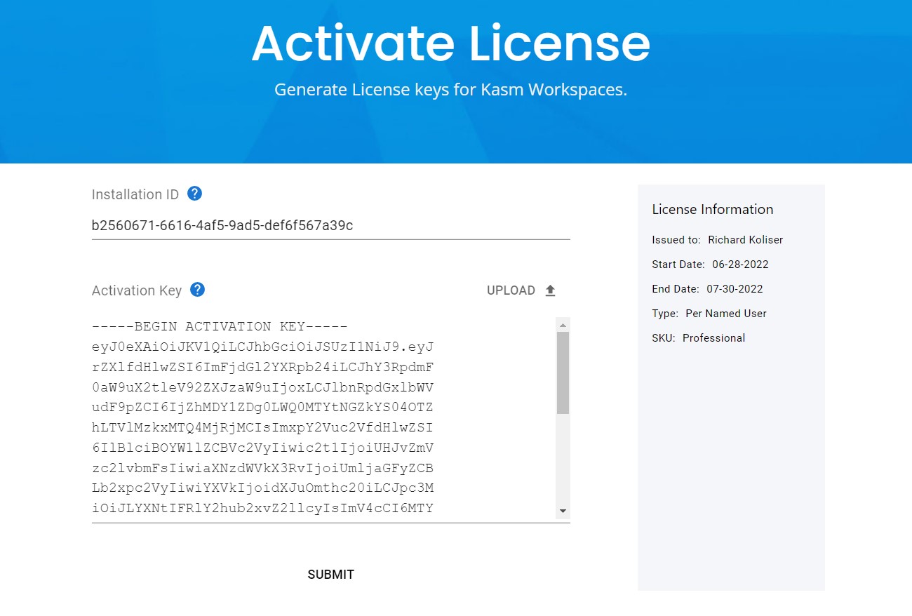 To license an existing Kasm Workspaces installation you will need the activation key that was provided when purchasing your Kasm Workspaces license.