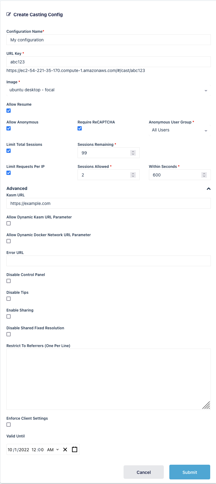 Session Casting allows administrators to expose external facing URLs that will automatically launch a Kasm session. These Casting URLs can optionally be unauthenticated and protected by ReCAPTCHA, Referrer, and IP rate limits.