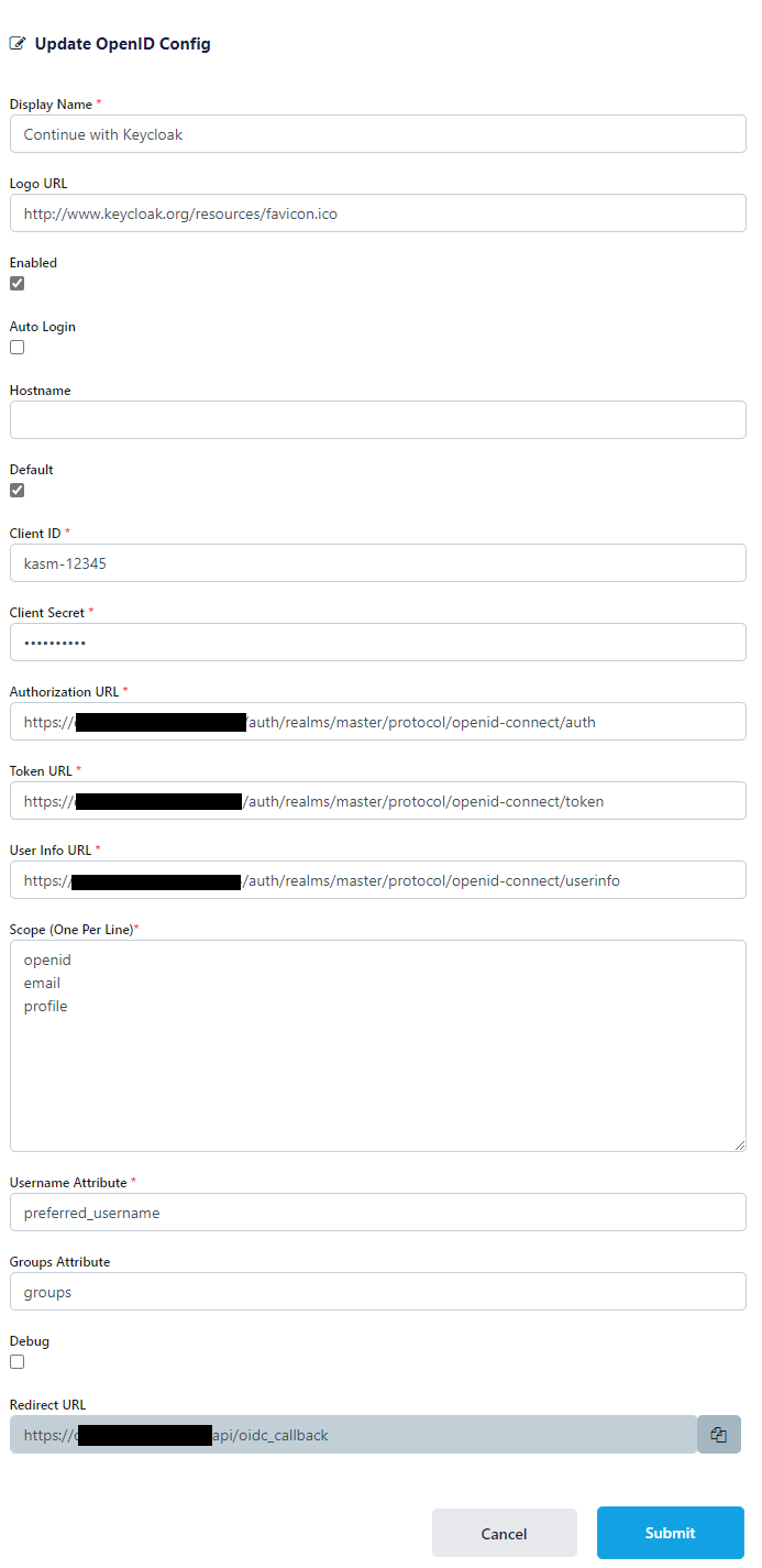 1. Logout of the Kasm to display the login screen. The OpenID configuration should be shown.