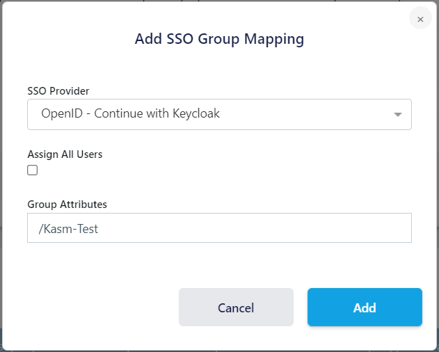 #. Then enter the Keycloak group name desired in the Group Attributes field, e.g /Kasm-Test. Note the slash. This is needed when Full group path is set in the Keycloak Client Mapper which is the default.