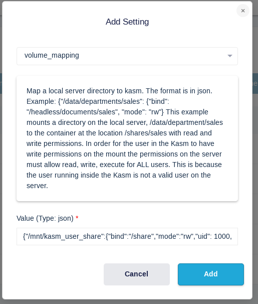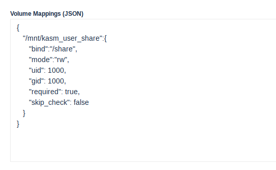 { "/mnt/kasm_user_share1":{ "bind":"/share1", "mode":"rw", "uid": 1000, "gid": 1000, "required": true }, "/mnt/kasm_user_share2":{ "bind":"/share2", "mode":"rw", "uid": 1000, "gid": 1000, "required": true } }