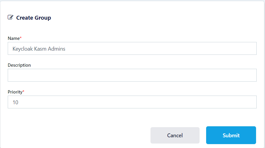 Name the Group Keycloak Kasm Admins and give it a priority (e.g 10).