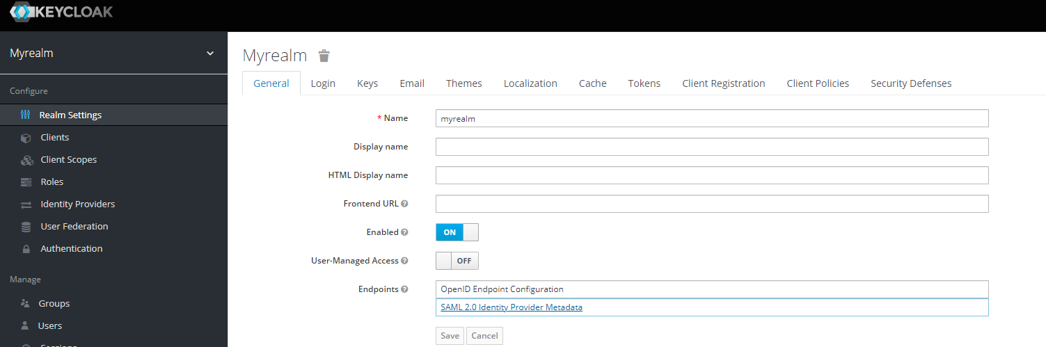 Navigate to the Keycloak Admin Portal. Select the desired Realm (e.g Myrealm) then select Realm Settings.
