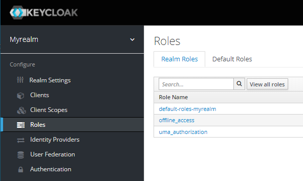 Navigate to the Keycloak Admin Portal. Select the desired Realm (e.g Myrealm) then select Roles.