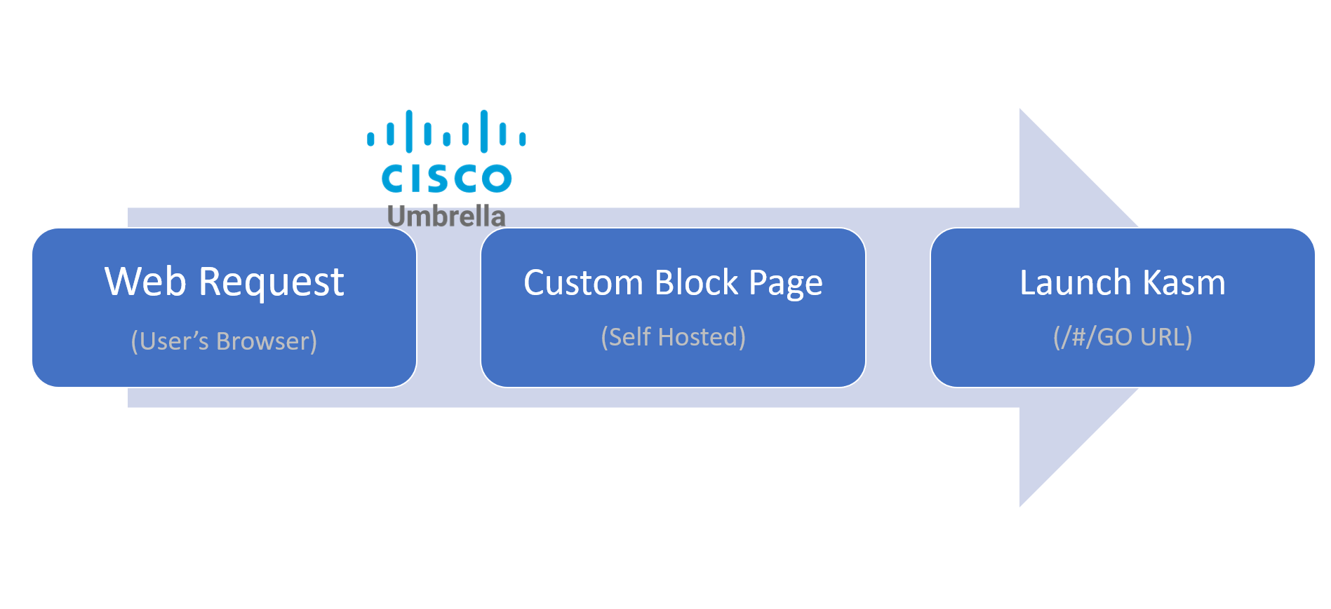 Administrators can configure Cisco Umbrella to redirect the user’s request to Kasm when a policy is violated. For example, it certain categories of sites are denied by Cisco Umbrella policy, the Administator may wish to provide access to the site only through Kasm isolation. This is instrumented via the use of a Custom Block Page that is coded to either automatically redirect the user to Kasm or provide a link for the user to click.