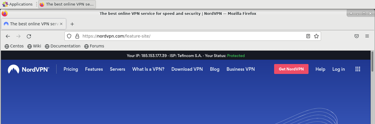 Most VPN providers will give some kind of indication that you are “protected” from their home page. Here we are using NordVPN, so lets open up Firefox from the desktop and navigate to https://nordvpn.com, you should see a Protected status: