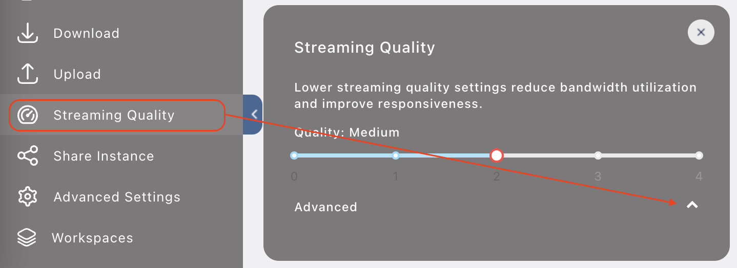 Users that require a finer control over streaming quality can use the advanced settings that can be found by toggling the Advanced dropdown available when a medium or higher quality is chosen.