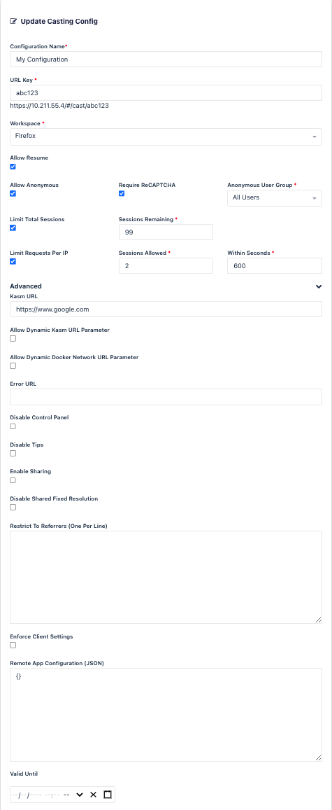 Session Casting allows administrators to expose external facing URLs that will automatically launch a Kasm session. These Casting URLs can optionally be unauthenticated and protected by ReCAPTCHA, Referrer, and IP rate limits.