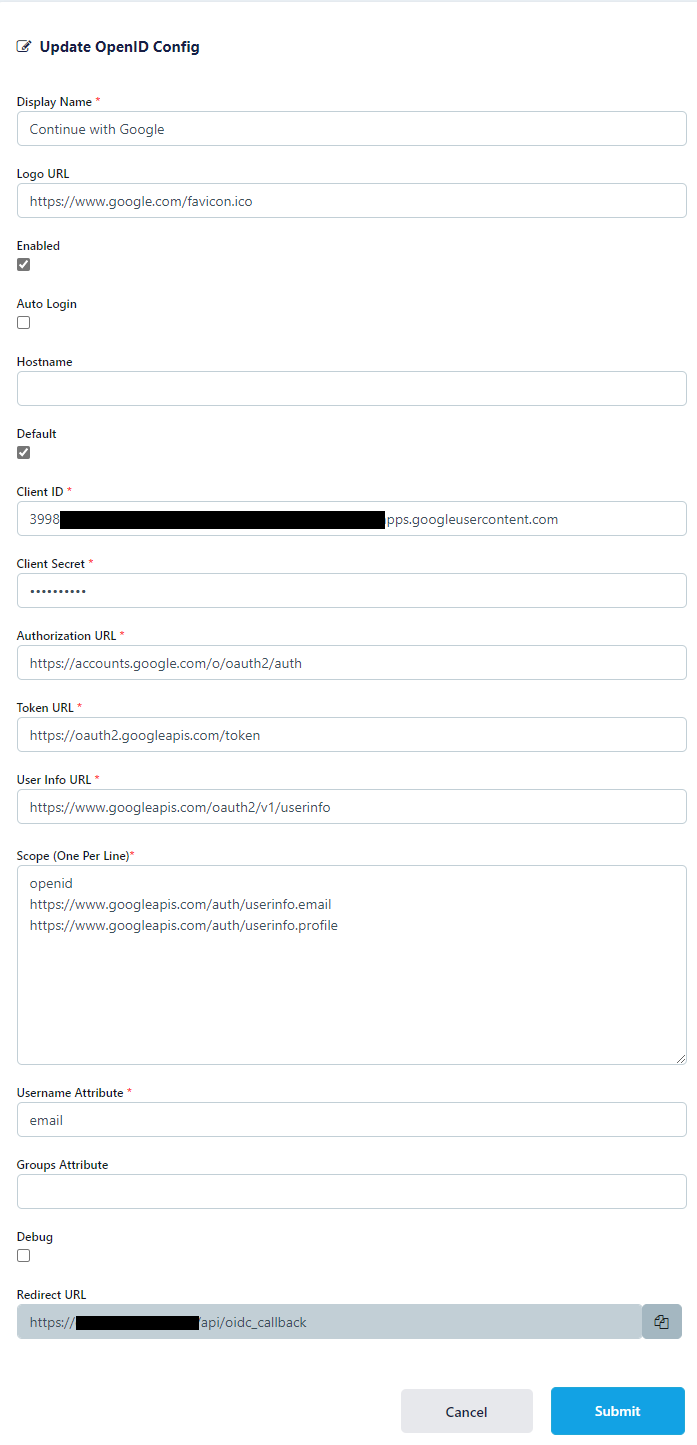 Update the form with the following entries, using the Client ID and Client Secret gathered in the previous section.