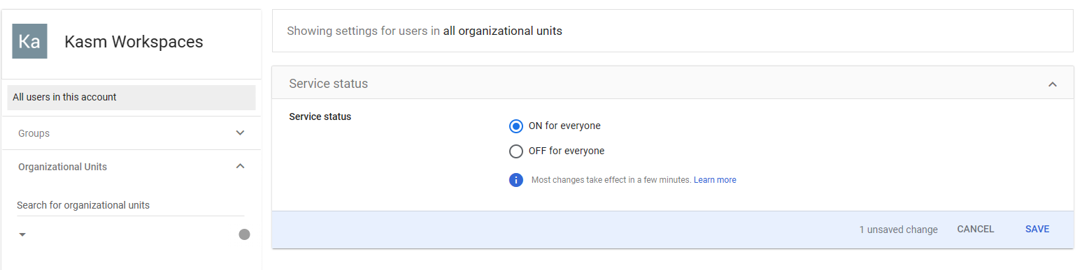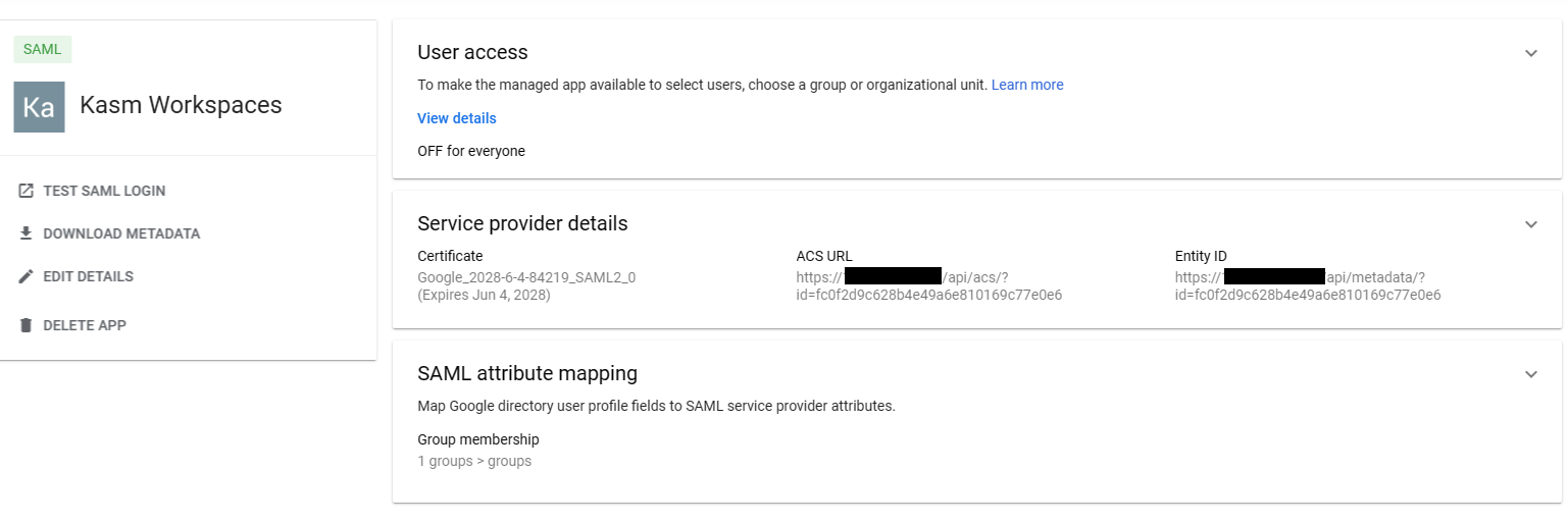 Once the Kasm SAML app is configured , access must be granted to Google users.