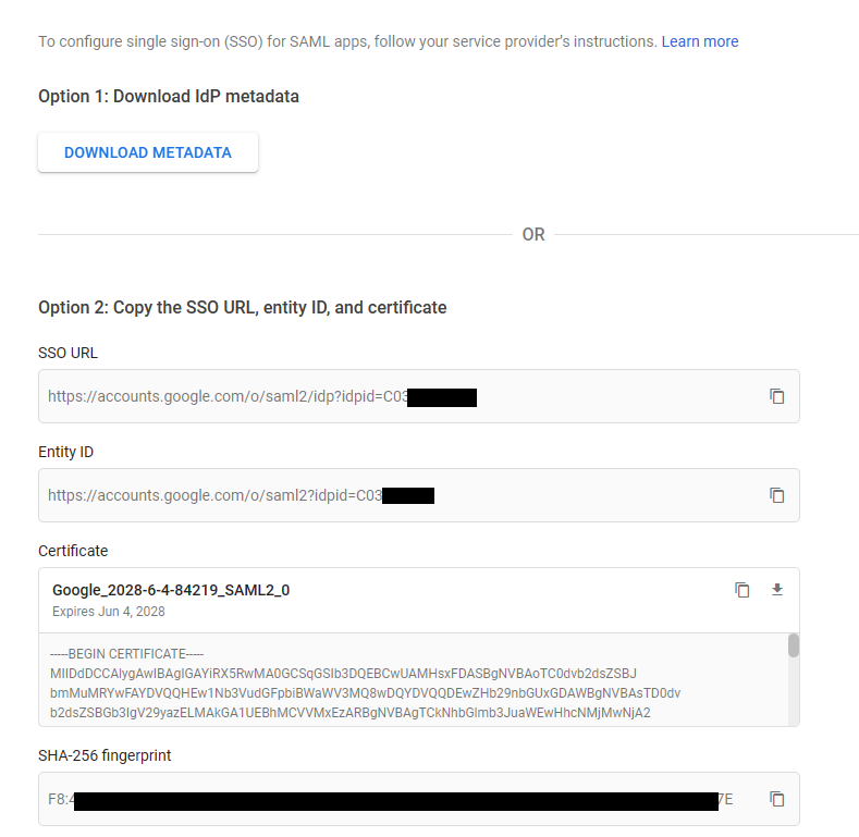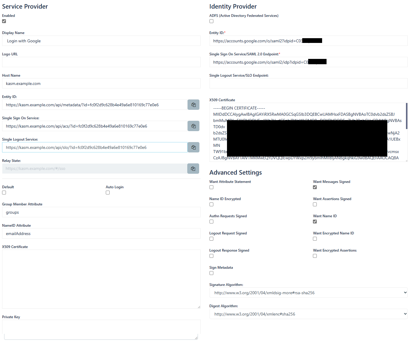 Copy the Google IdP entries to the Identity Provider section of the Kasm SAML Configurations started in the previous section. Then click Continue.