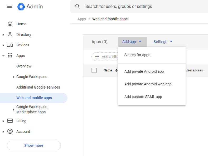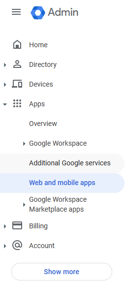 Open the Google Admin Console, Expand Apps, then Select Web and mobile apps.