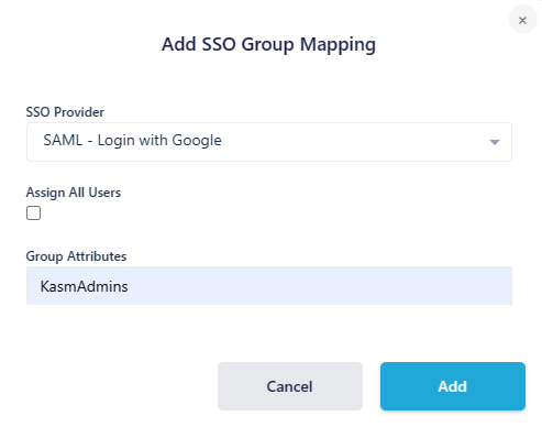In the previous steps, the Google Workspace SAML configuration was configured to pass the KasmAdmin