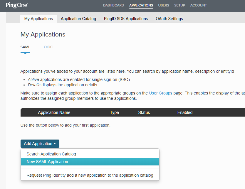 In the PingOne Admin portal, click Applications -> My Applications -> Add Application -> New SAML Application