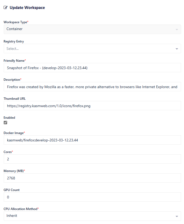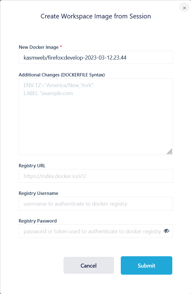 Administrators can create new docker images from active container-based Workspace sessions. While it is recommended to utilize a more formal build process for creating images, automatically creating them from active sessions presents a simple process creating images that may require steps that cannot be automated.