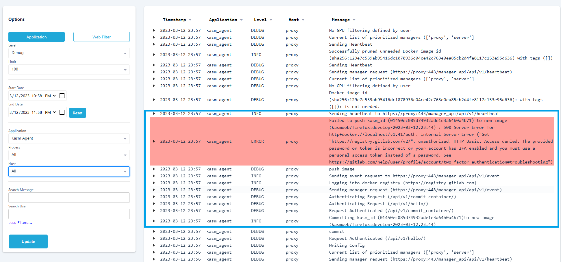 docker commitwith the new image, and if configured in the previous from will attempt adocker pushto the registry provided. This is a background task, so administrators may need to review the logs to identify failures in the process. For example, an error is shown below for a failed image push.