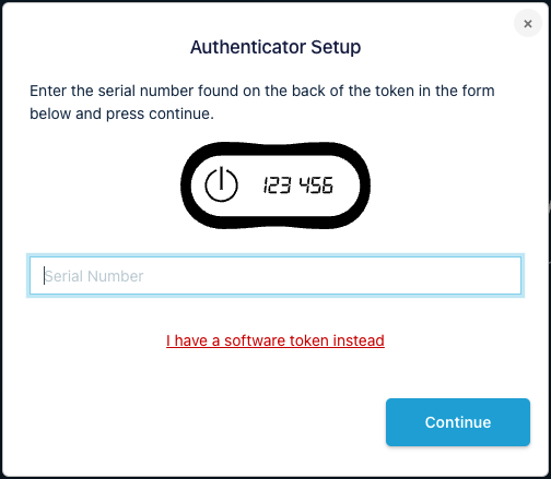 If an administrator does not explicitly assign a token to a user, the user can input the serial number on login to self register the token. A user will only be able to self-register a token if they are required to login with two factor authentication and they don’t currently have a token assigned. Under those conditions, the user will be prompted to setup a token on login. The user will need to select the “I have a physical hardware device instead” link, which will then display the following dialog where they can enter the serial number located on the back of the physical token.