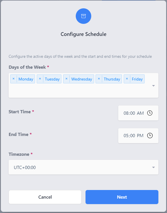 Click on Add Schedule to create a new schedule for the AutoScaling configuration. On the Add Schedule screen there are fields for what days of the week this schedule should be active as well as both a start time, end time, and a timezone. Kasm will convert the time from the Kasm database to match the timezone specified when determining if a schedule is active or not.