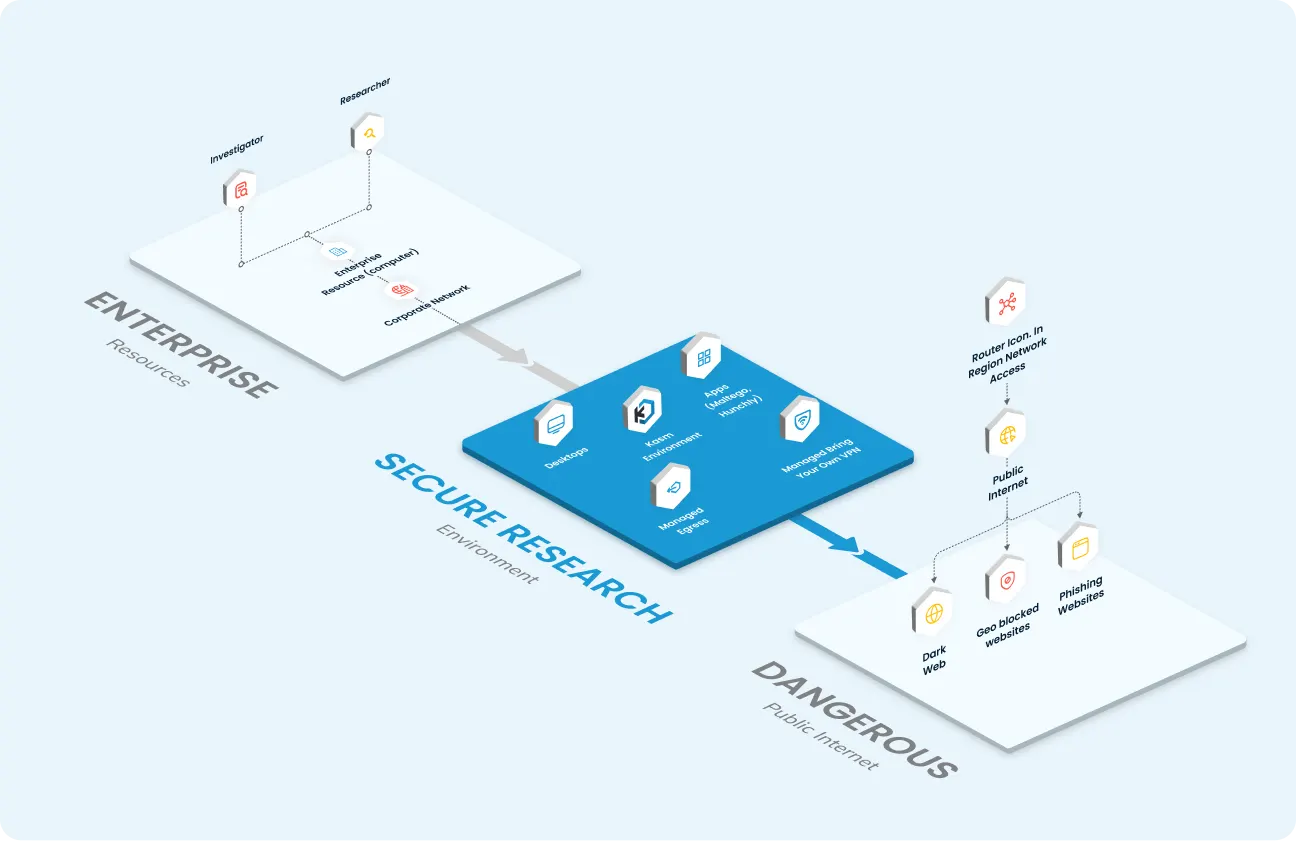 Conduct secure OSINT and digital investigations across surface, deep, and dark web environments with policy-controlled, non-attributable access suitable for sensitive or classified missions.